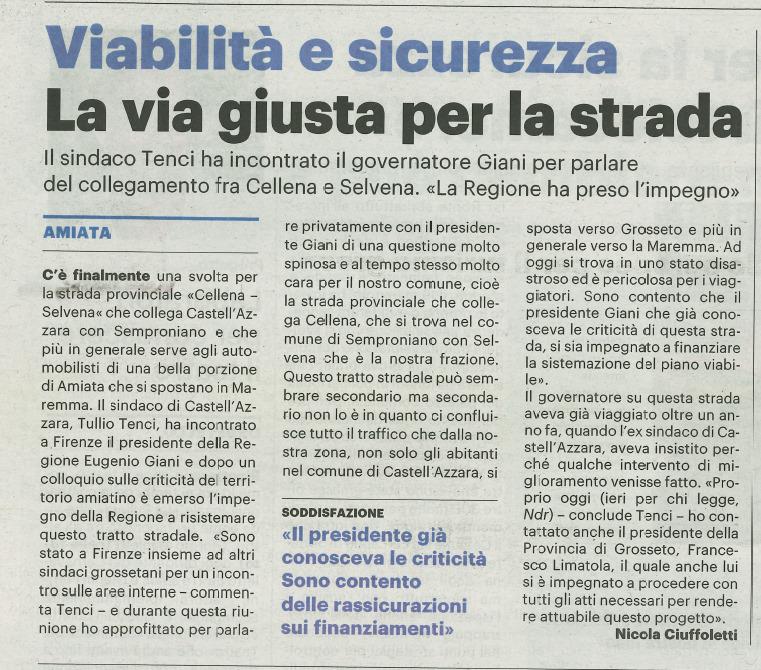 A seguito dell'incontro del Sindaco Tenci con il Presidente della Regione Giani, ecco l'articolo uscito oggi sulla Nazione in tema viabilità e sicurezza in merito alla strada Provinciale Cellena - Selvena.