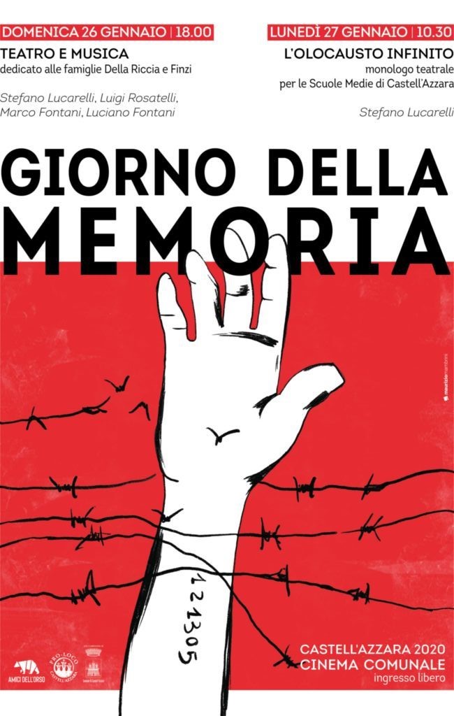 Castell’Azzara celebrerà la Giornata Internazionale in memoria delle vittime dell’olocausto con un doppio appuntamento che prenderà avvio, nella sala cinematografica comunale, alle ore 18,00 di domenica 26 gennaio con un momento comune di narrazione e musica eseguito dagli attori Stefano Lucarelli, Luigi Rosatelli e dai musicisti Marco Fontani e Luciano Fontani.